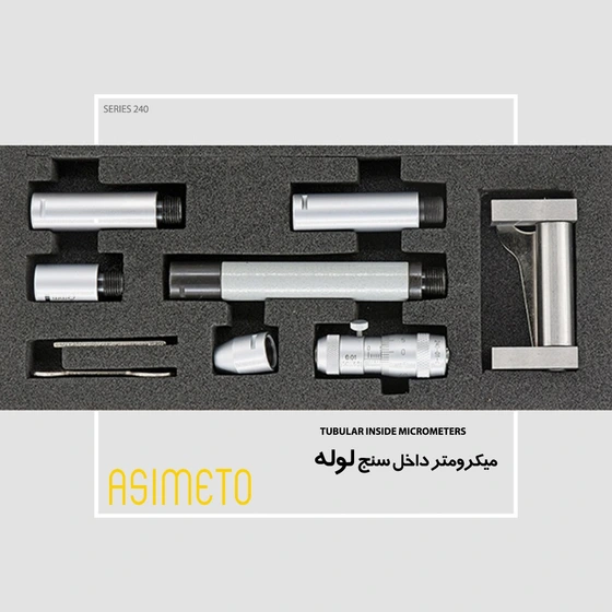 میکرومتر داخل لولهای مدل 0‑11‑240 از سری ابزارهای دقیق کمپانی آلمانی ASIMETO است. جدول مشخصات آن شامل دامنه اندازهگیری 50 تا 100 میلیمتر، دقت 0.01mm، وزن تقریبی 420 گرم و طراحی مکانیکی مقاوم برای استفاده صنعتی میباشد.